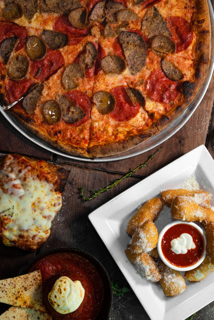 Our wood-fired pizza ovens cook your pie at over 800 degrees, guaranteeing the perfect crispy dough, and is similar to a traditional Neapolitan style with light toppings and sauce.
